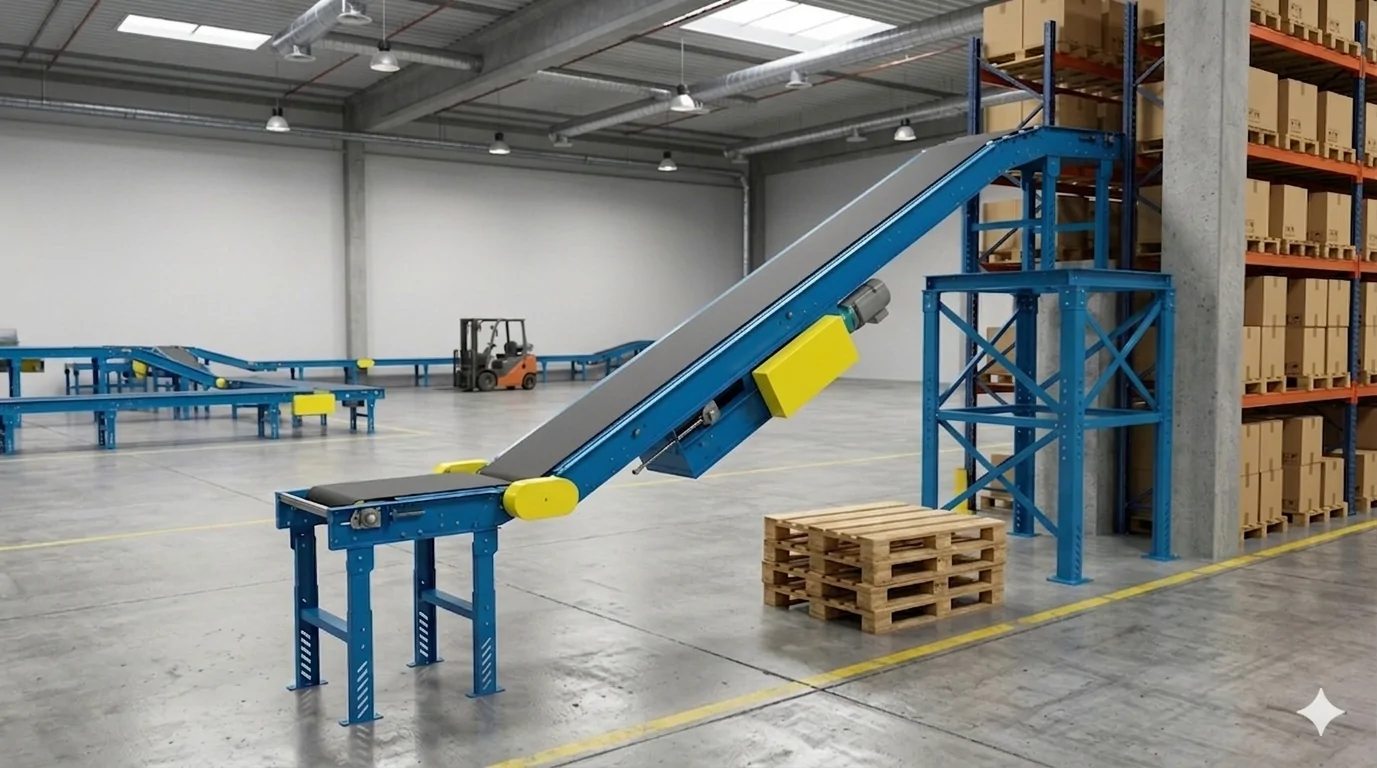 Transportadores Inclinados de Banda sobre MesaLos Transportadores Inclinados de Banda sobre Mesa cuentan con una inclinación para bajar o subir cajas.