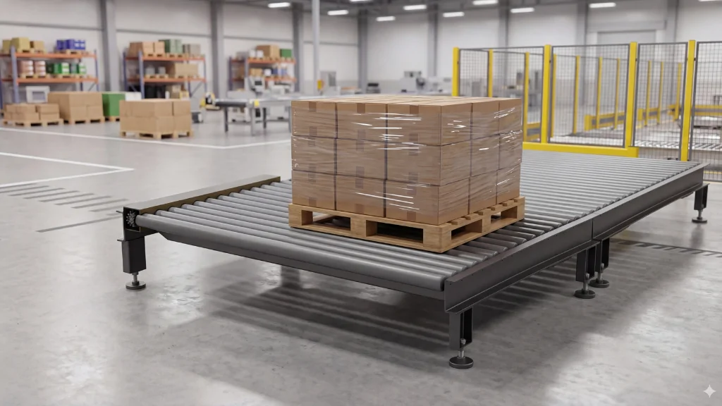 Un Transportador de Estibas (palets) de Rodillos por Cadena es un equipo robusto diseñado específicamente para mover cargas pesadas que una banda de caucho o rodillos livianos no podrían soportar.